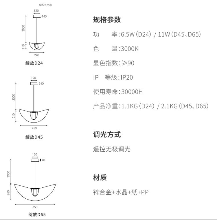 利用材料物理弹性,,透过巧妙的结构,,,,灯罩在空间里呈现一个富有张力和生机的曲面,,,仿佛在空间里热烈绽放的花朵,,灯罩表面采用手工敷纸工艺,,更加的朦胧舒适,,,,纸纤维的材质也让灯光更加温柔。。。选用实心高级无铅水晶材质,,,,这种材料洁净无瑕的透明度与低色散特性,,,,硬度高,,,多用于精密光学器件及高端水晶制品,,,,更好展现丰富光影质感。。。。