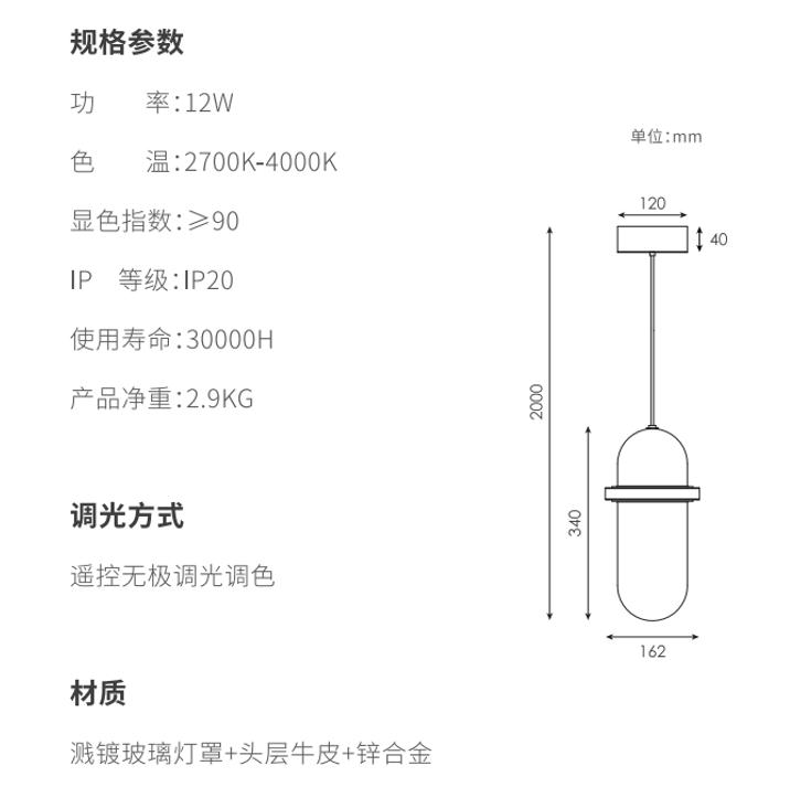 美时吊灯灵感源自早晨的光线,,,穿透云雾渺渺的大气层洒到地上。。美时外层的玻璃自上而下从深色到透明的渐变镀层还原了这一情境,,,,光透过双层玻璃形成丰富的折射效果,,,一如破晓时的光线充满朝气,,,采用上下两路光组合,,,,下路光直出提供主要光线,,,,上路光提供氛围光。。。上路光在手工吹制玻璃的不规则壁厚折射下,,呈现了极其丰富的变化,,,采用头层牛皮作为一个点缀,,缓冲了玻璃与金属带来的冰冷和生硬的感觉,,取得了视觉的平衡。。。