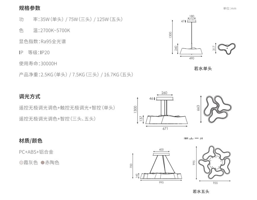 若水吊灯源于中国古典意境中的山水,,外形如山的曲线婀娜蜿蜒,,其内侧光晕水波纹,,,缓缓晕开;巧妙地将曼妙光影融于山水意境,,,如空间中悬浮的自然景观,,,,专门设计调试的水波纹棱面扩散罩可以起到一定的视觉防眩作用,,,把原本进入到人眼的杂散光折射掉,,同时可以提升产品的精致品质感;空间光的强功能性和强装饰性通常是个矛盾点,,,但是若水则取得了一个平衡,,保证较强光学输出的同时可以有其装饰表现